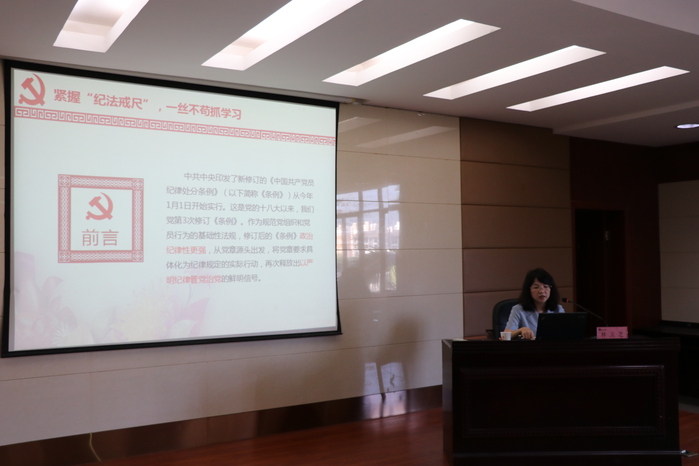 林玉芝以《学习贯彻<中国共产党纪律处分条例> 以党风廉政建设成效提升干事创业实绩》为主题,从“紧握‘纪法戒尺’,一丝不苟抓学习”“保持‘赶考清醒’,一针见血找问题”,“时常‘叩问初心’,一股干劲拼事业”三个方面展开,为师生阐述了修订后《条例》的具体内容,高度概括了本次修订的特点,结合不同层面、不同领域、不同类型的典型案例深刻剖析了《条例》所明确的违反六大纪律的行为,警醒师生党员千万不要把制度当成“稻草人”,千万不要把责任当成“耳边风”,千万不要把纪法和规矩当成“纸老虎”。