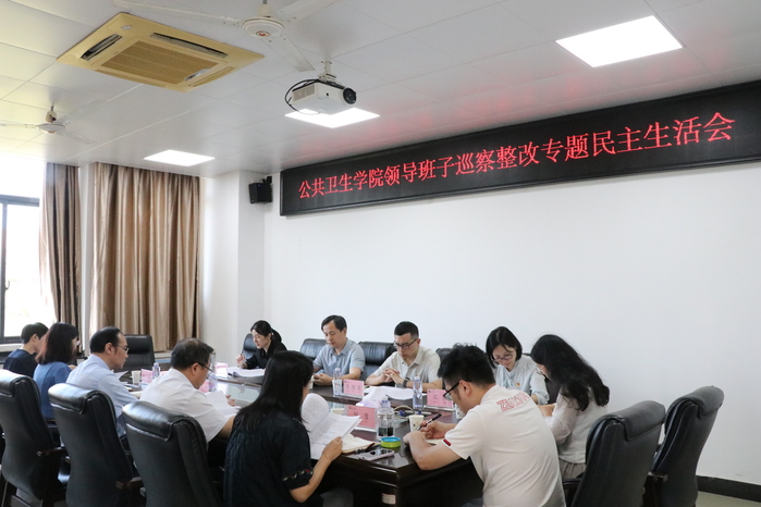 1021午,公共卫生学院召开巡察整改专题民主生活会,校党委常委、副校长陈万金,巡察办副主任张劲龙以及校纪委和校党委组织部同志莅会指导。