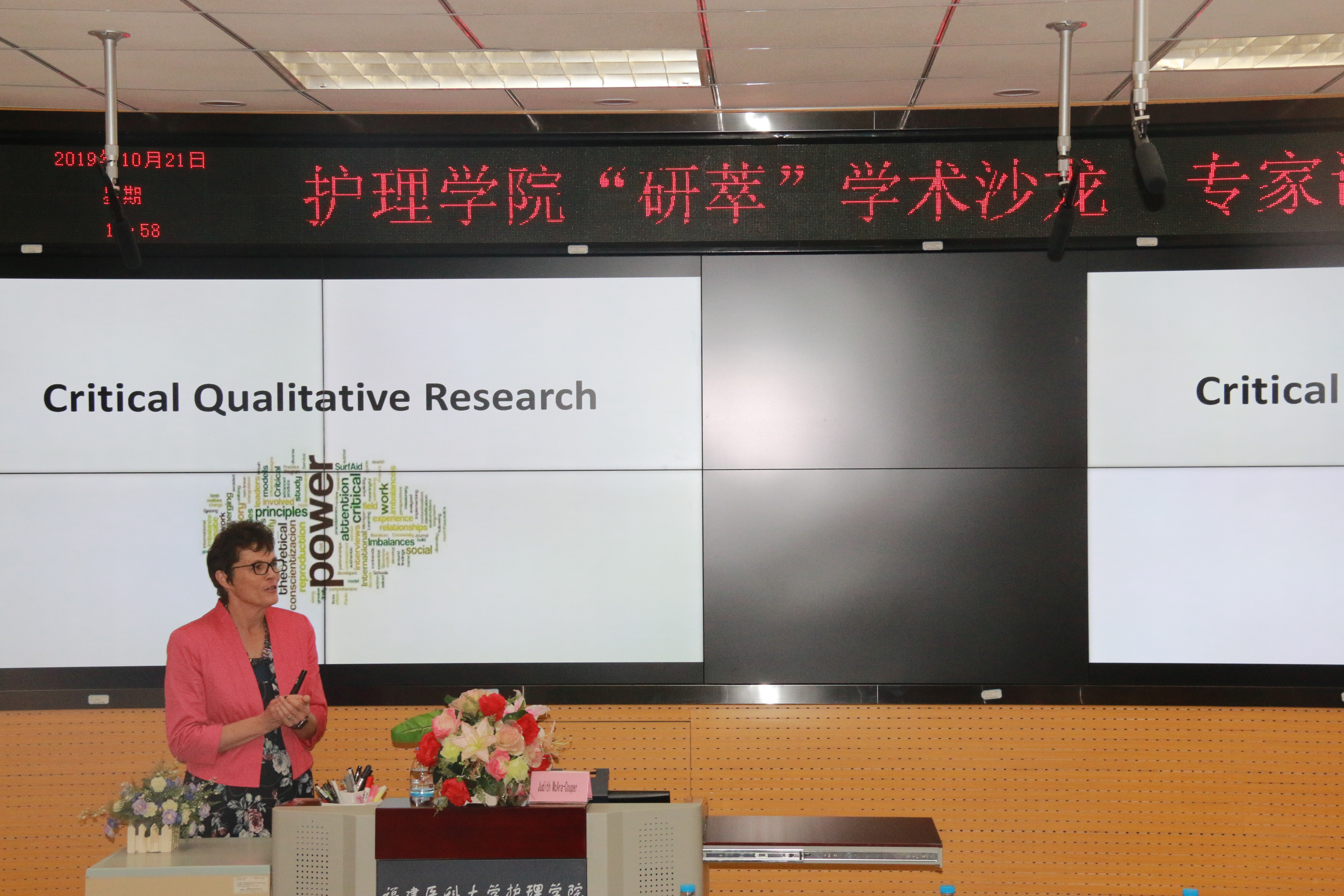 10月21日,护理学院于上街校区田家炳楼护理学院示教室,举办以“Critical Qualitative Research”为主题的“研萃学术沙龙首讲。新西兰助产理事会主席、奥克兰理工大学助产系主任、妇女健康研究中心联席主任Judith教授结合大量科研实例,围绕3 S’--- “Shaped, Shaping, Shaper”深入解读了评判性质性研究的理论基础、内涵、及适用范围。学院师生100多人到场聆听与交流。