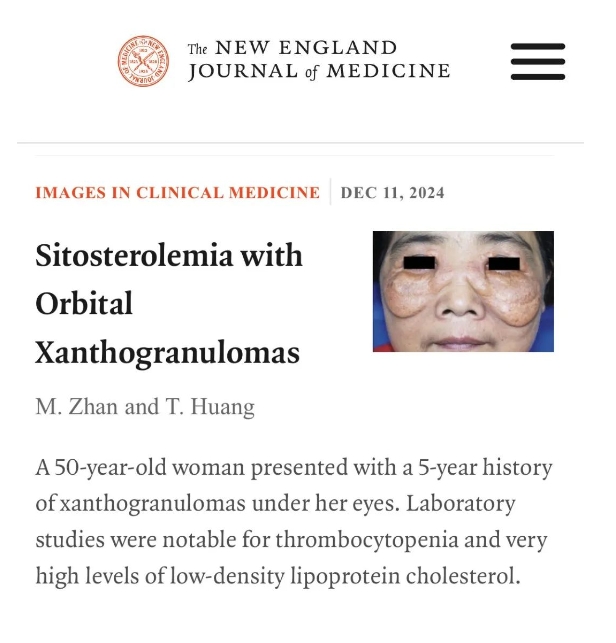 12月11日,亚洲中文精品乱码附属协和医院整形外科与再生医学科詹明坤医师与复旦大学医学遗传研究院黄涛生教授开展合作研究,在新英格兰医学杂志(the New England Journal of Medicine, NEJM)发表题为“Sitosterolemia with Orbital Xanthogranulomas”的临床病例诊治研究报道。