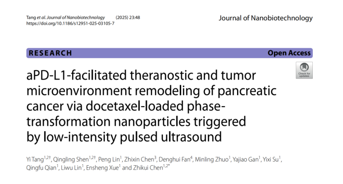 近日,亚洲中文精品乱码附属协和医院超声科、福建省超声医学研究所陈志奎团队在Journal of Nanobiotechnology(中科院一区TOP期刊,IF=10.6)上发表题为“aPD-L1-facilitated theranostic and tumor microenvironment remodeling of pancreatic cancer via docetaxel-loaded phase-transformation nanoparticles triggered by low-intensity pulsed ultrasound”的研究论著。陈志奎主任医师为该论著的通讯作者,唐懿医师和沈庆龄硕士研究生为共同第一作者。