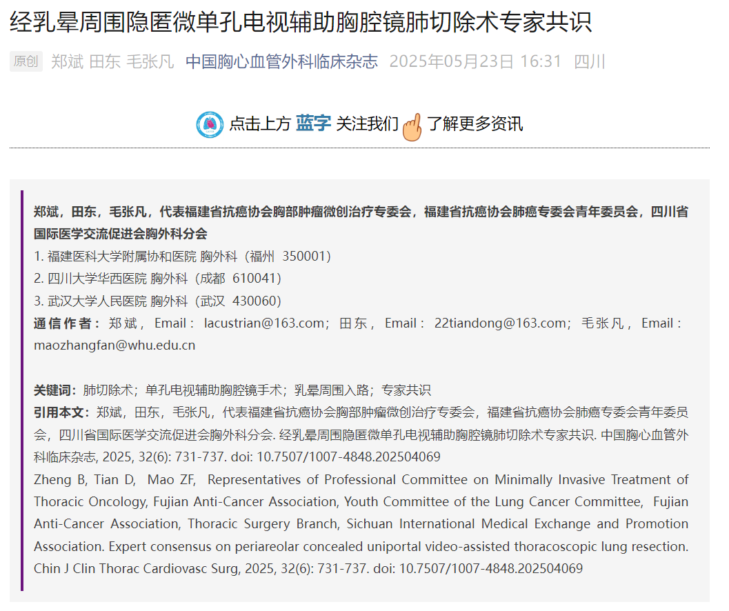 《经乳晕周围隐匿微单孔电视辅助胸腔镜肺切除术专家共识》正式发布于《中国胸心血管外科杂志》官方公众号